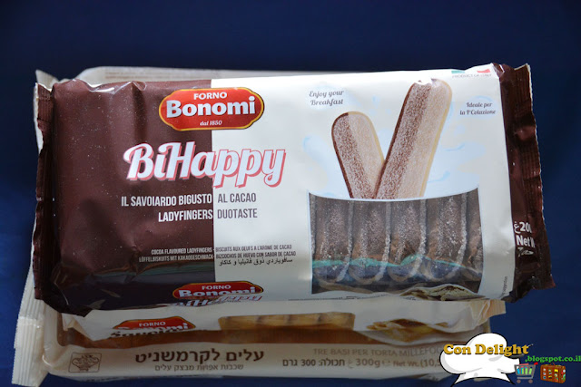 לעוגת הטירמיסו הזו השתמשתי במוצר שקיבלתי לסקירה - בישקוטים בשני טעמים: וניל וקקאו ובשני צבעים של חברת בונומי המיובאים ומשווקים בארץ על ידי חברת דנשר.