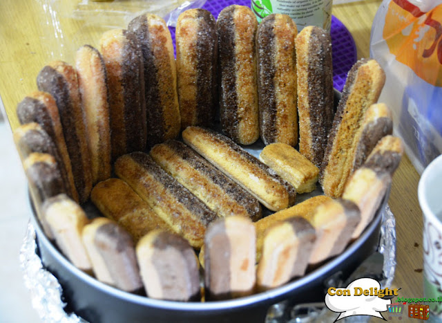Dip just a bit and onlt one side of the ladyfingers (I dipped the side with the sugar) and place in the circumference of the pan with the dipped side turned into the inside (I used the ladyfingers with two colors for the circumference and for the inside you can use regular).