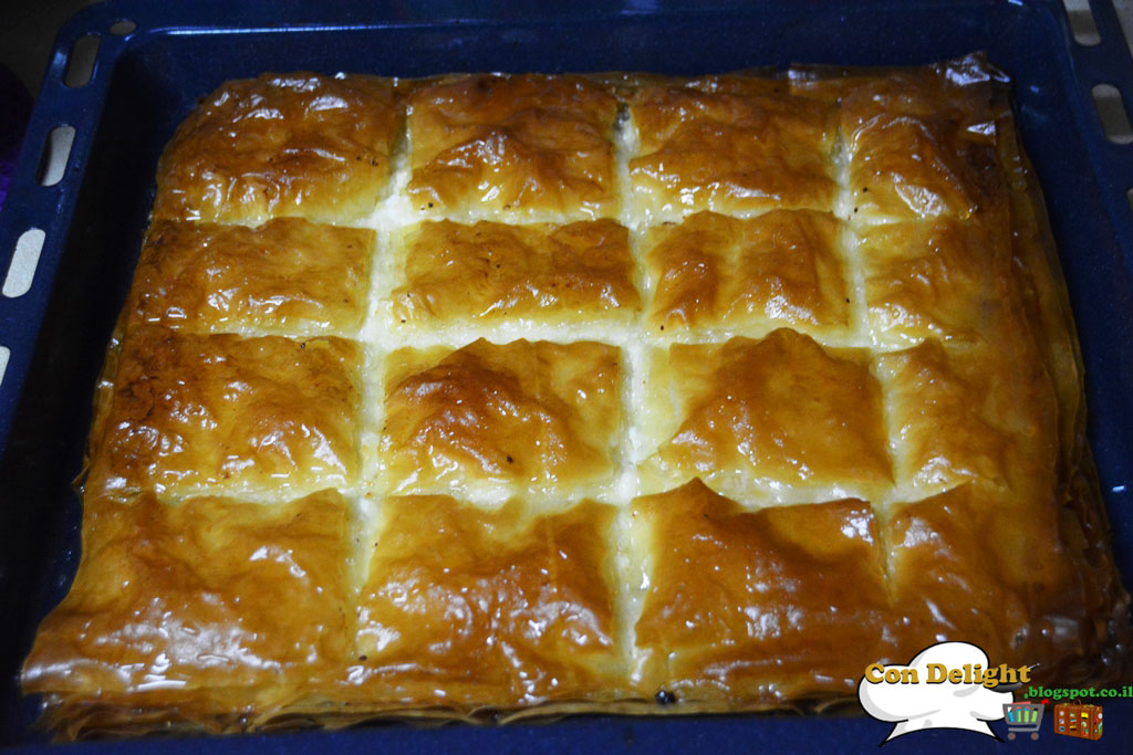 לאחר שמרחתם את החמאה על הדף החמישי של עלה הפילו, מערבבים את הגבינות ומפזרים עליו ודואגים שעל הקצוות לא יהיו מילוי. מורחים את הגבינות בחמאה מומסת ושוב חוזרים על הפעולה ממקודם: עלה פילו, חמאה, עלה פילו וחוזר חלילה, כאשר אחרי כל עלה מהדקים את הקצוות עד שסיימתם את יתרת עלי הפילו.